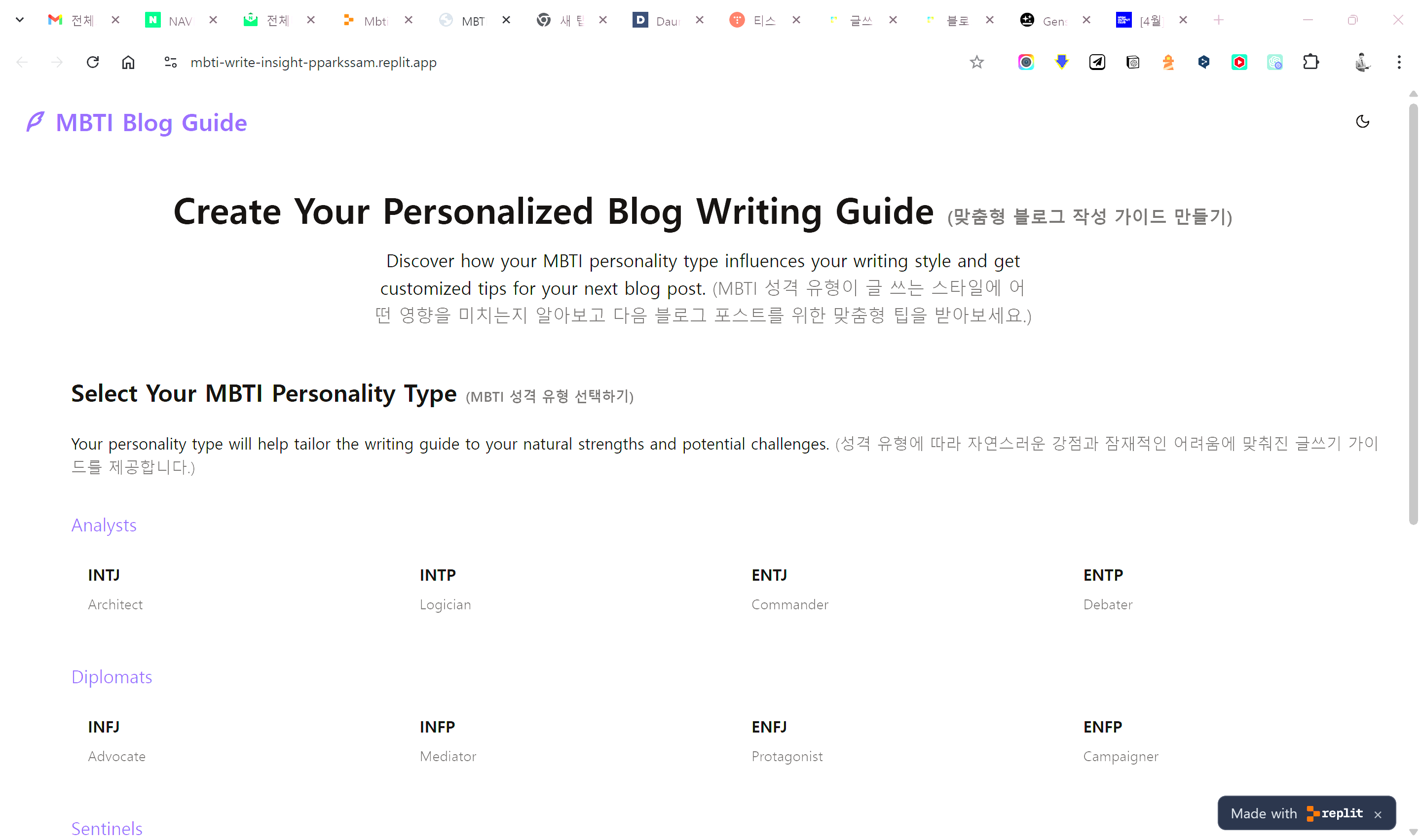 사용자의 글쓰기 패턴을 분석하여 MBTI 성격 유형을 예측하는 AI 기반 서비스입니다. 레플릿 AI와 ModelFarm을 활용하여 NLP 모델을 쉽게 통합했고, 실시간 텍스트 분석 기능을 구현했습니다. 기존 방식으로는 이런 수준의 AI 통합에 며칠이 걸렸을 텐데, 레플릿 환경에서는 몇 시간 만에 가능했습니다.