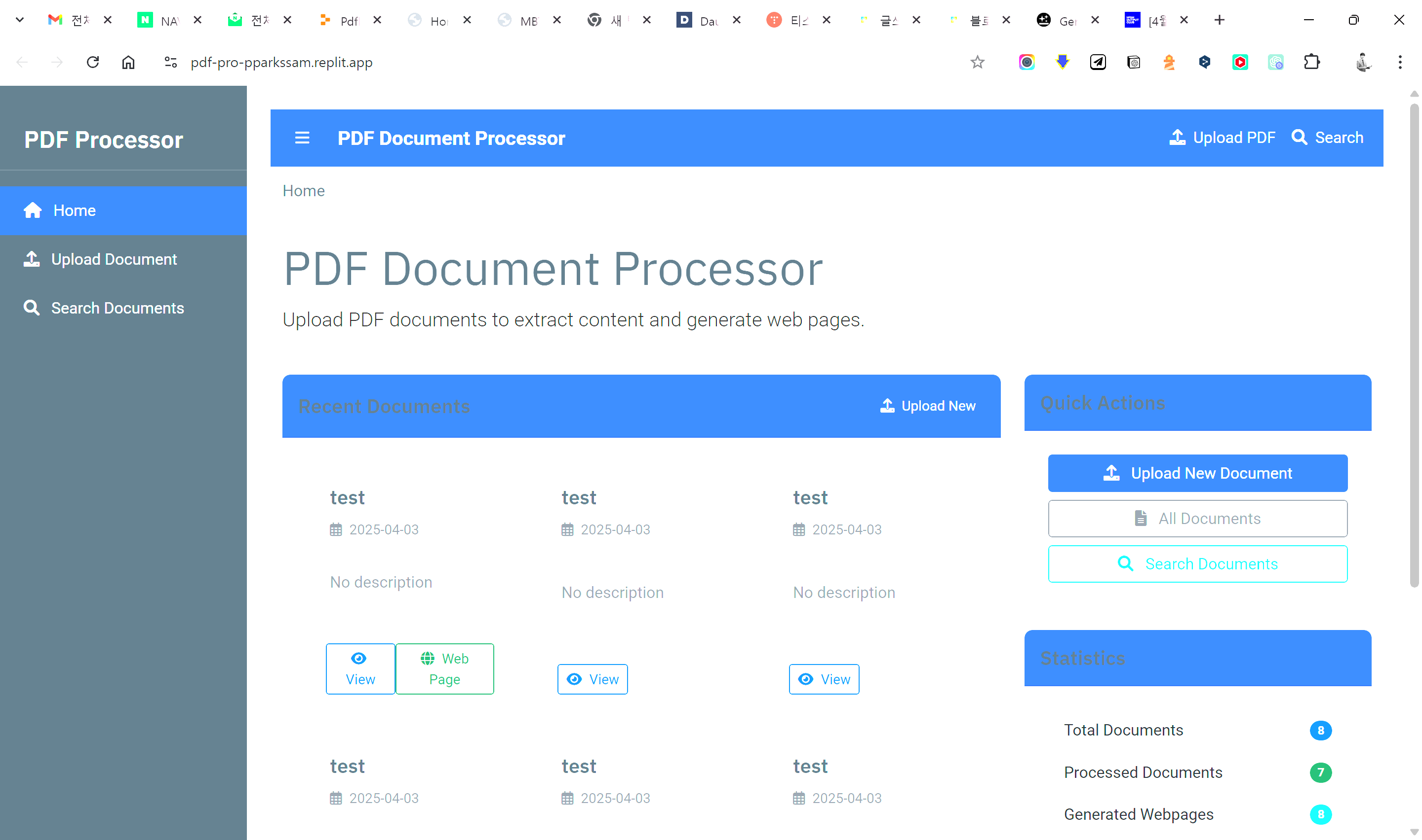 PDF 문서 관리 및 변환 기능을 제공하는 웹 서비스입니다. 레플릿의 파일 처리 기능과 서드파티 라이브러리 통합이 얼마나 간편한지 확인할 수 있었습니다. 특히 환경 변수 관리와 배포 과정이 단순화되어 있어, 백엔드 로직 구현에 더 집중할 수 있었습니다.